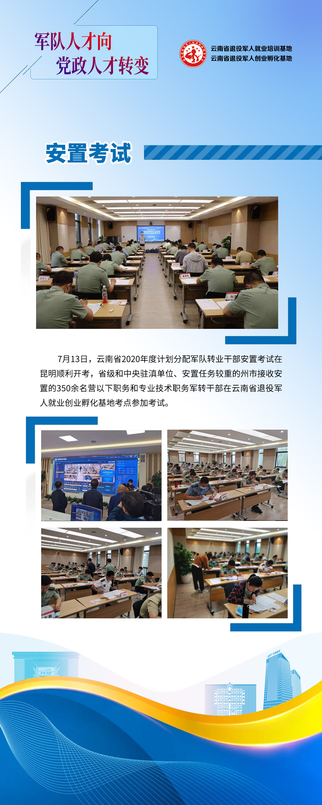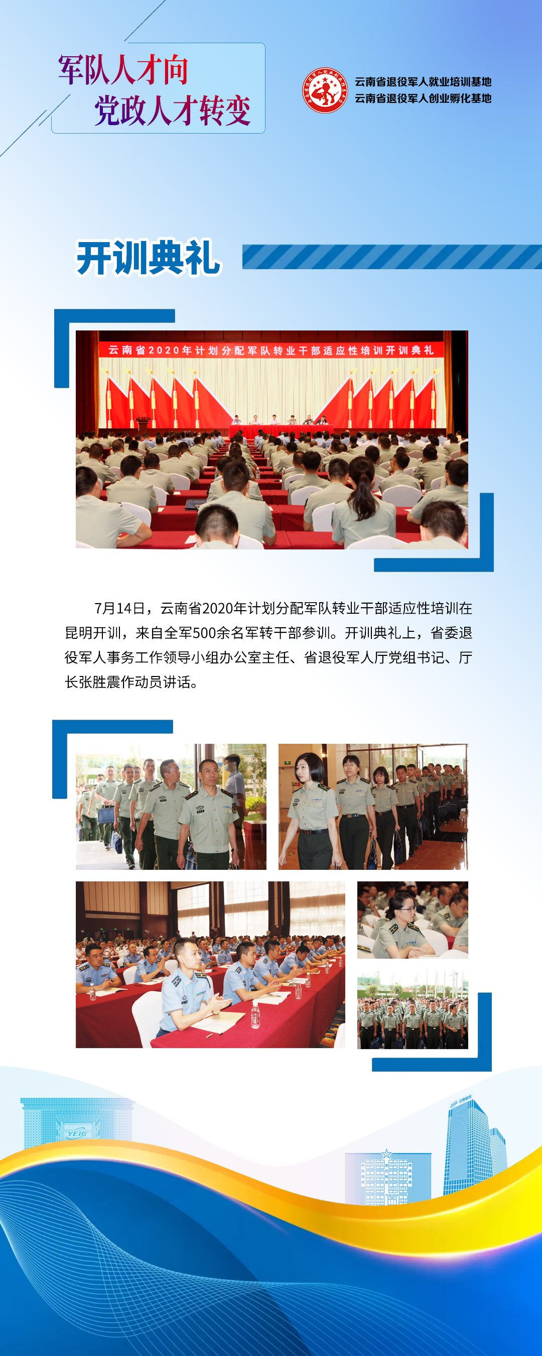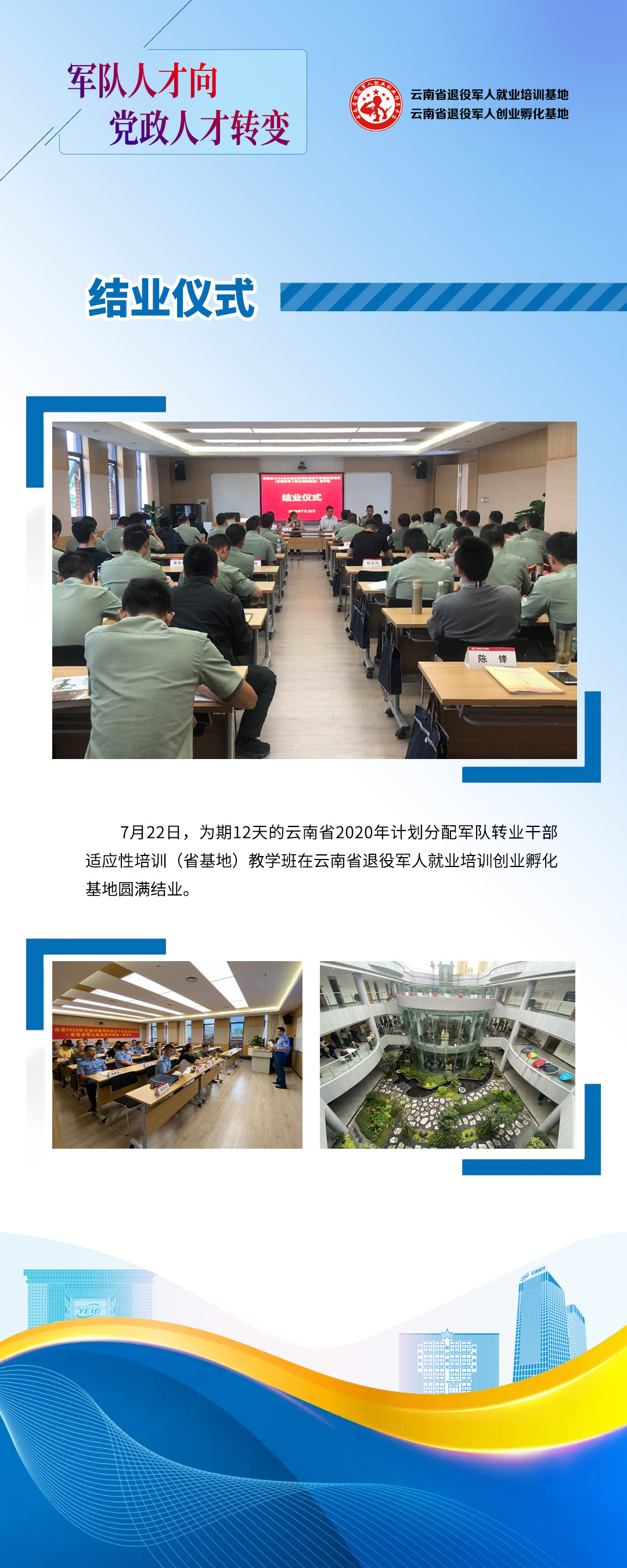 7月22日,為期12天的云南省2020年計劃分配軍隊轉業(yè)干部適應性培訓(省基地)教學(xué)班在云南省退役軍人就業(yè)培訓創(chuàng )業(yè)孵化基地圓滿(mǎn)結業(yè)。本次培訓由云南省退役軍人事務(wù)廳移交安置處主辦,省退役軍人培訓中心承辦,省基地協(xié)辦,在昆明主城區、曲靖市、玉溪市、紅河州、大理州、麗江市安置的營(yíng)級以下職務(wù)和專(zhuān)業(yè)職務(wù)計劃分配的353名軍轉干部在省基地參加培訓。
