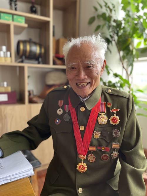 上圖:胡國祥拿著(zhù)“中國人民抗日戰爭勝利70周年紀念章”深情回憶。