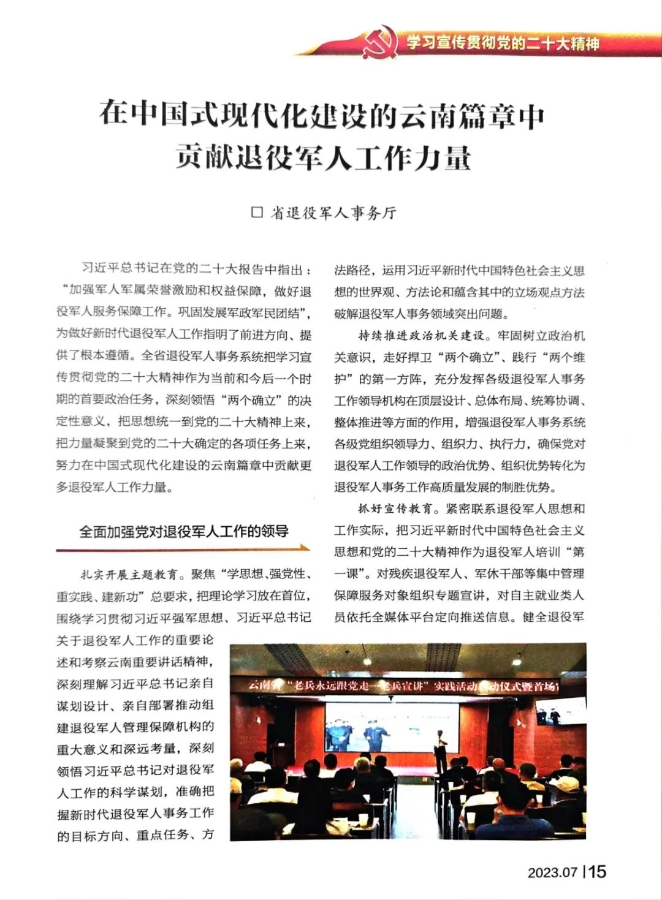 《云南通訊》2023第07期 刊發(fā)省退役軍人事務(wù)廳文章 《在中國式現代化建設的云南篇章中貢獻退役軍人…
